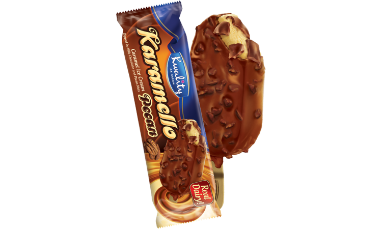 Kwality Karamello Pecan Ice-Cream Stick is a delicious frozen treat that features a blend of creamy ice cream, rich caramel sauce, and crunchy pecans, all in a convenient stick form.