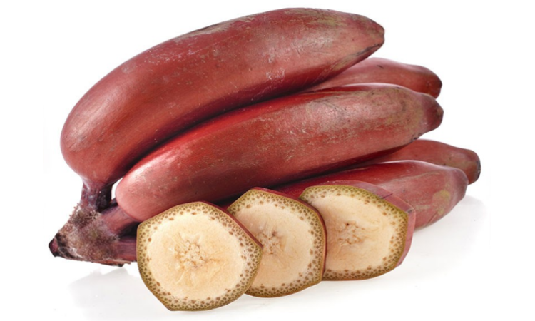 Red bananas are shorter, plumper and heartier than the average banana. It should only be eaten when ripe as an immature Red banana taste's like a dry and chalky starch. When ripe, it will have a thick, brick red peel and ivory-hued semi soft flesh. Its flavor is sweet and creamy with raspberry highlights.